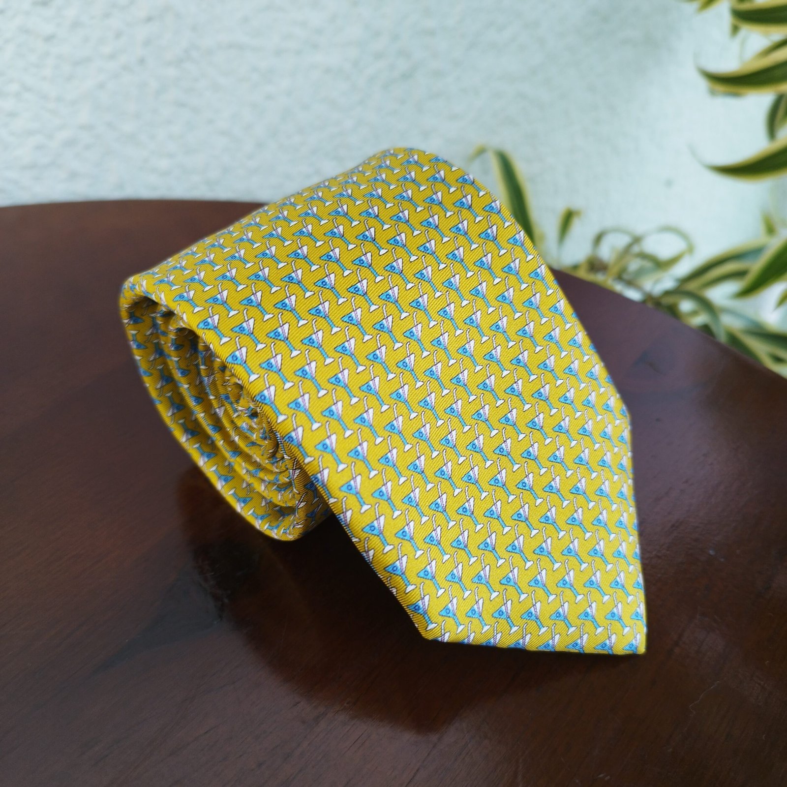 Gravata tradicional amarela esverdeada com estampa de taça. Largura: Regular – 8cm.