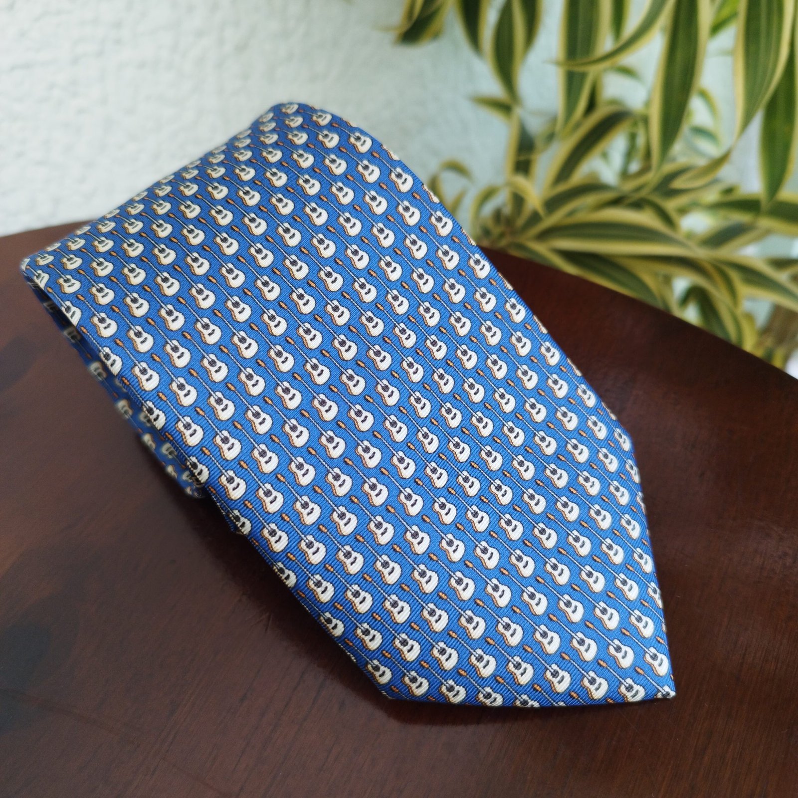 Gravata tradicional de seda azul com estampa. Largura: Regular – 8cm.