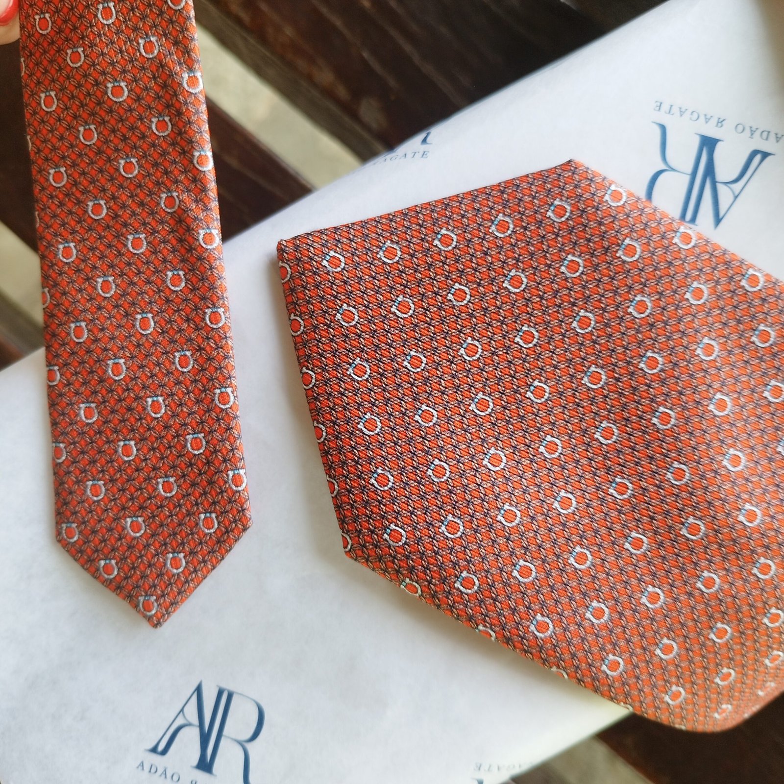 Esta gravata apresenta uma estampa única em tom laranja com detalhes geométricos que remetem a ferraduras estilizadas. A combinação entre o fundo vibrante e os padrões simétricos cria uma peça cheia de personalidade, ideal para quem deseja se destacar com autenticidade e elegância. Seja para eventos formais ou para trazer um toque de estilo a looks do dia a dia, esta gravata é a escolha perfeita para quem aprecia sofisticação aliada a um design criativo.