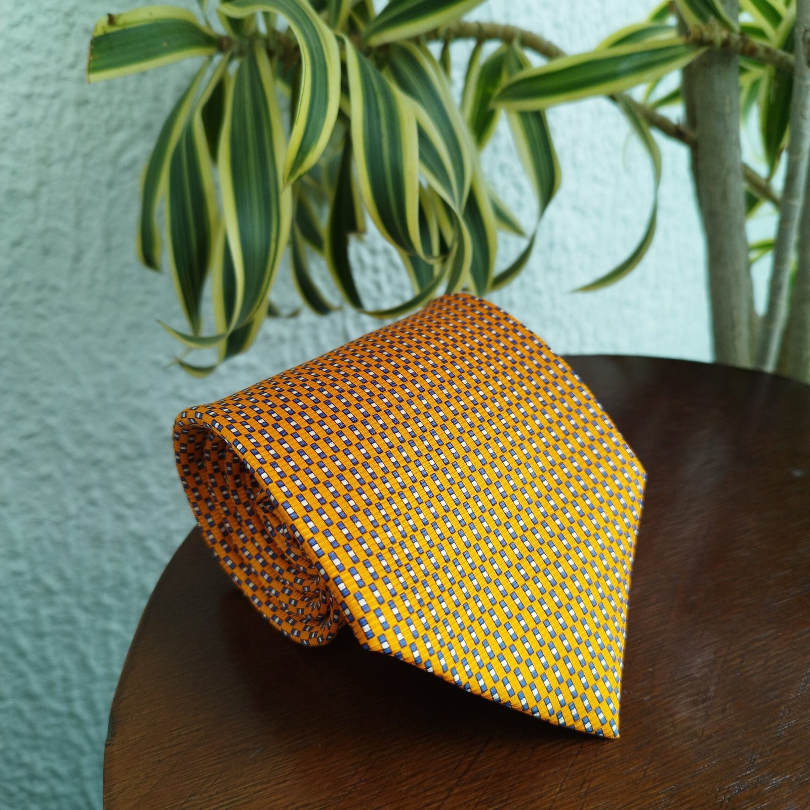 Gravata laranja com estampa azul e branca