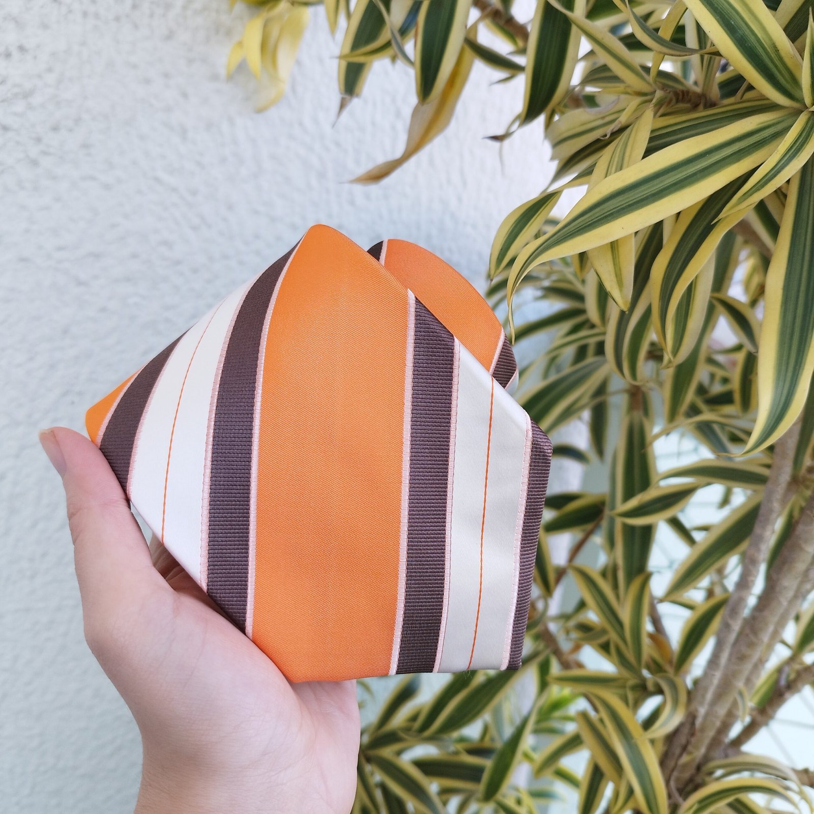 Gravata tradicional de seda listrada laranja, marrom e branca. – Largura 9,5cm