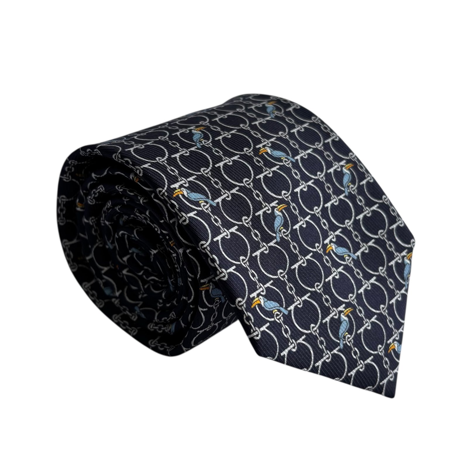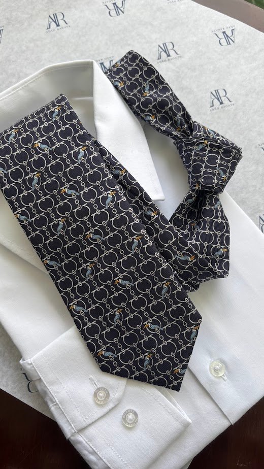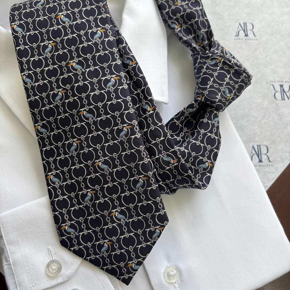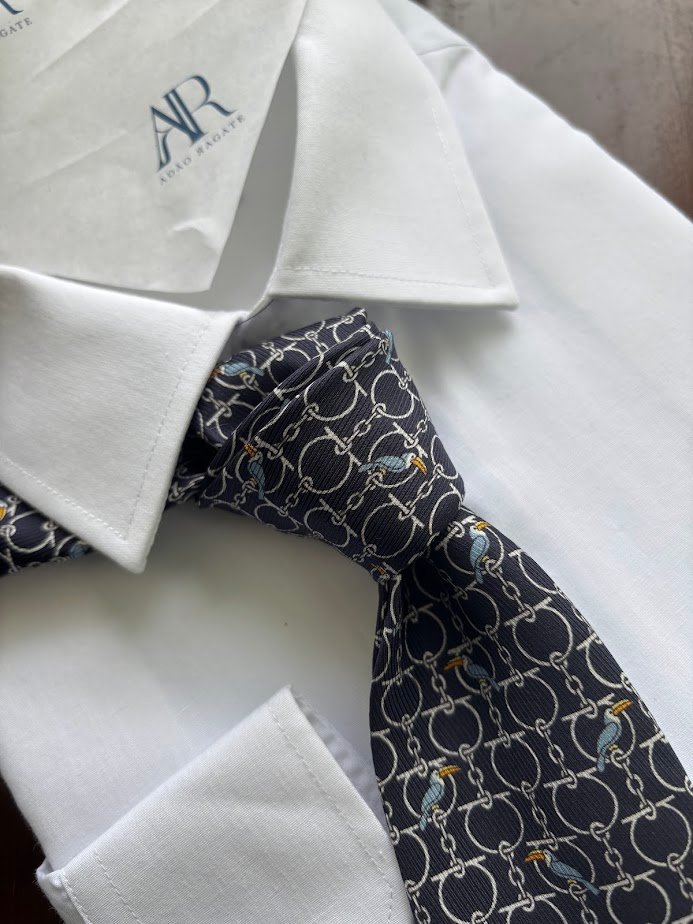 Esta gravata preta com estampa de tucano azul é um exemplo claro disso. A sobriedade do fundo escuro garante versatilidade e refinamento, enquanto o tucano — com bico em amarelo e laranja vibrantes — adiciona um toque artístico, tropical e ousado na medida certa. É o equilíbrio perfeito entre o clássico e o criativo.
