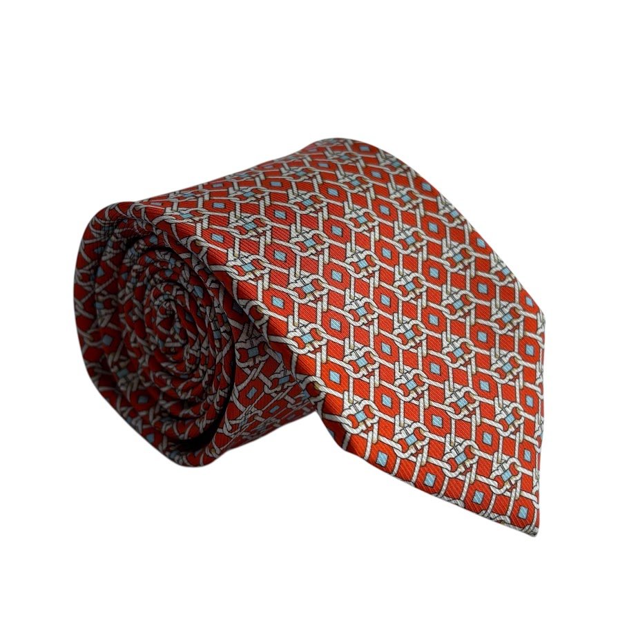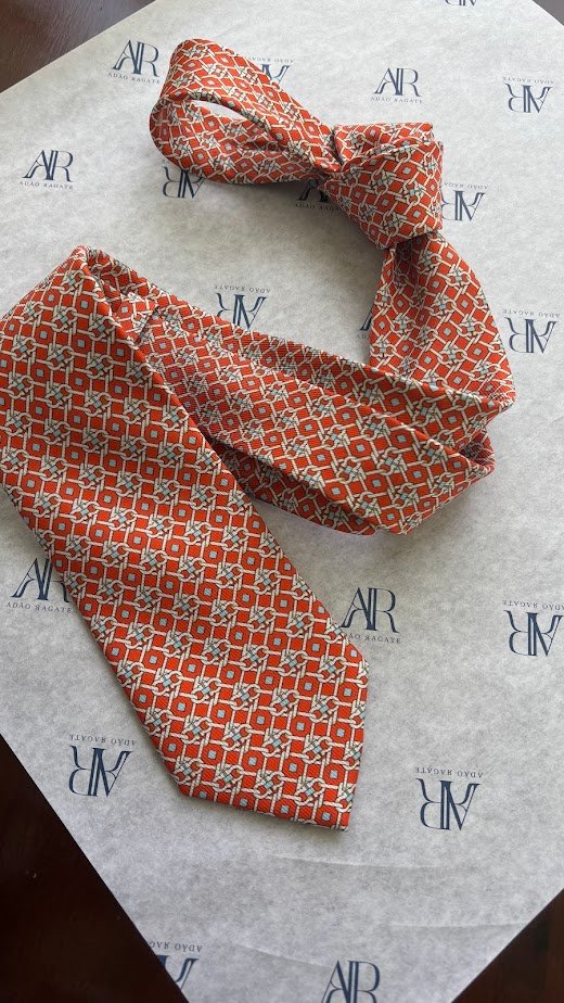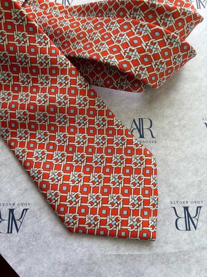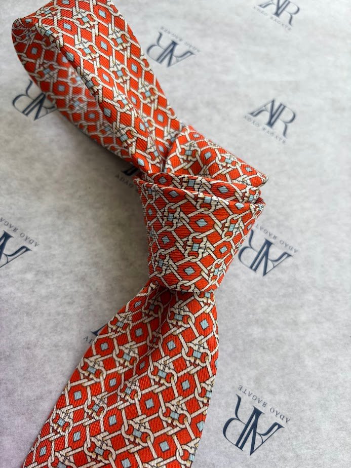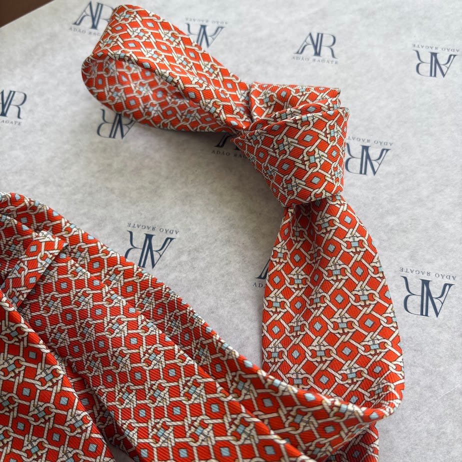A seda é o tecido que nunca sai de moda: elegante, macio e com caimento impecável. Nessa gravata, o fundo vermelho intenso reforça a ideia de poder e confiança, enquanto a estampa geométrica branca acrescenta sofisticação e equilíbrio visual.