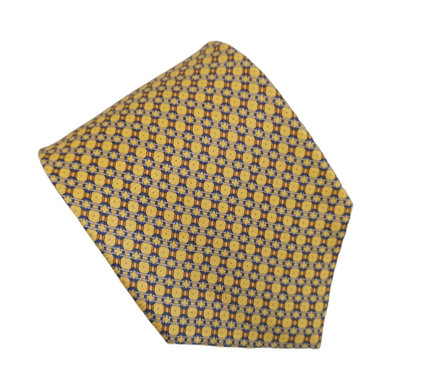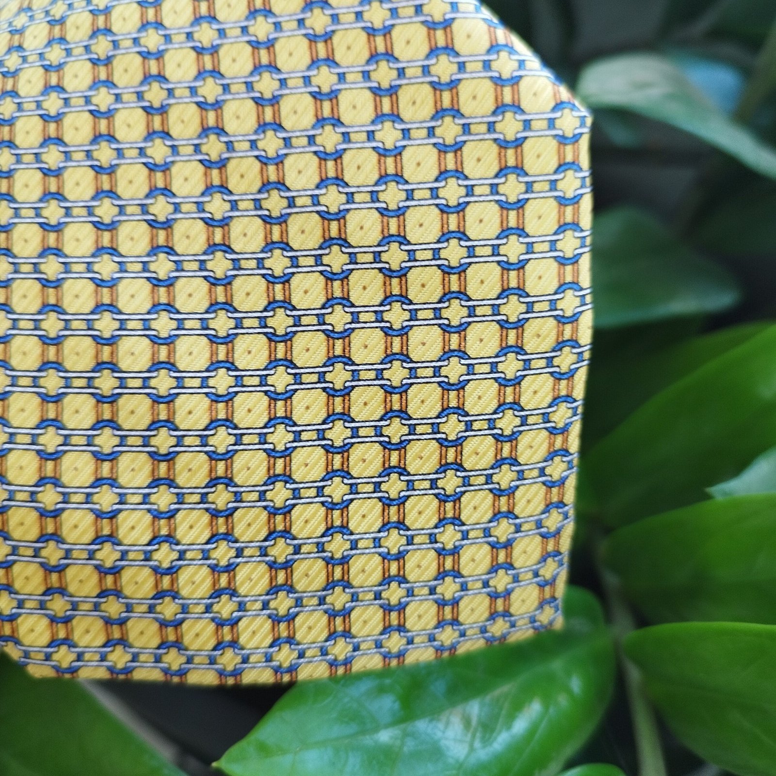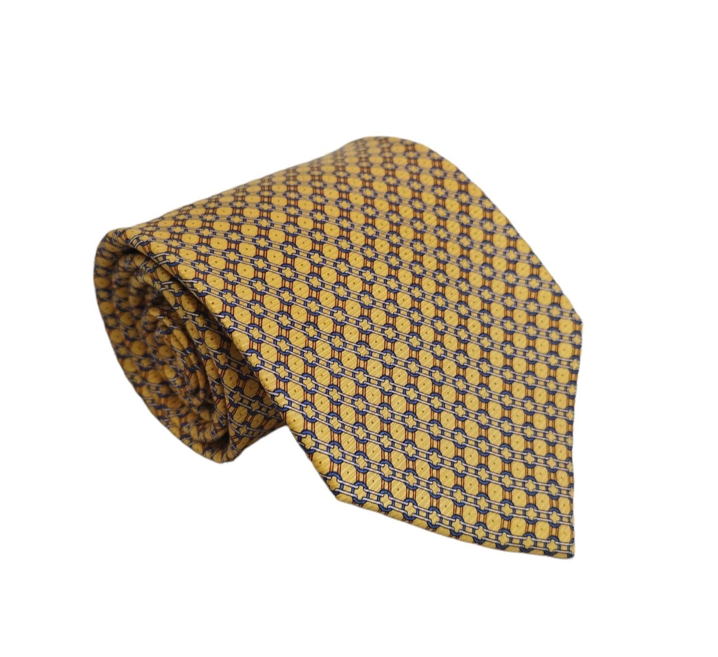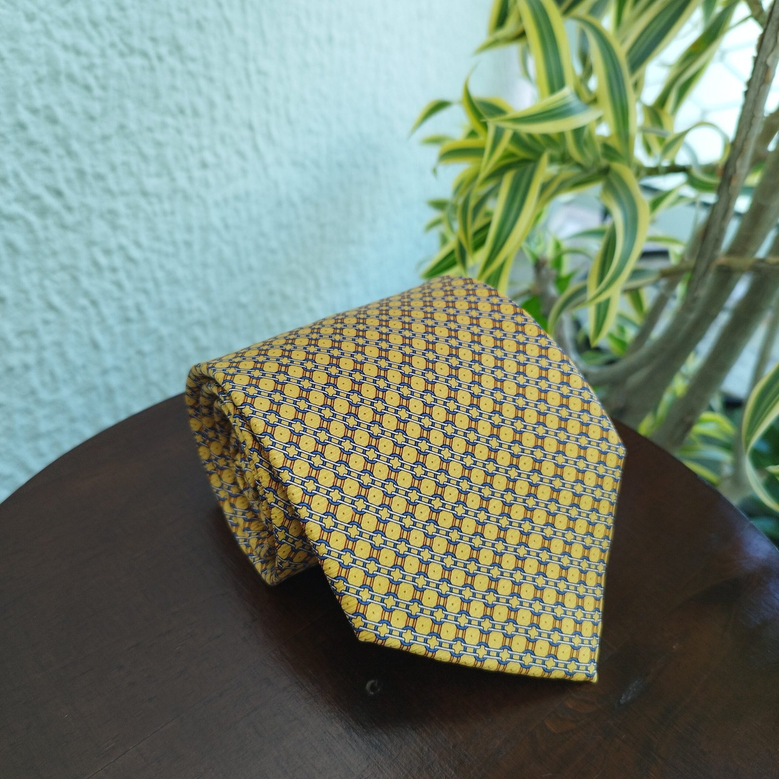 Gravata tradicional dourada com detalhes em azul. Largura: Regular – 10cm.