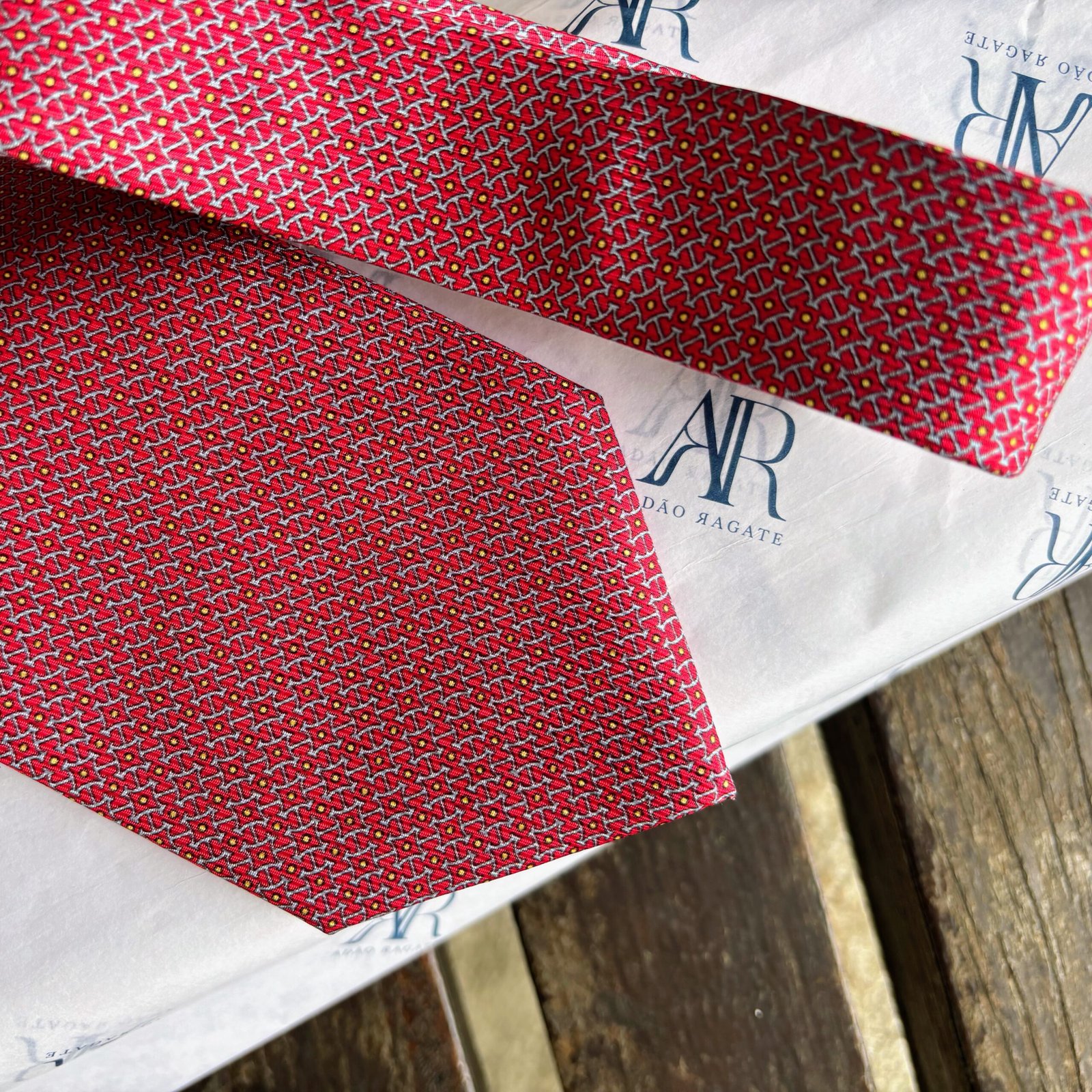 Essa gravata fúcsia é confeccionada em seda pura e se destaca pela estampa geométrica delicada, que cria um visual sofisticado e ao mesmo tempo moderno. A cor fúcsia traz personalidade e elegância, sendo ideal para quem deseja fugir do óbvio sem perder a sobriedade do traje social.